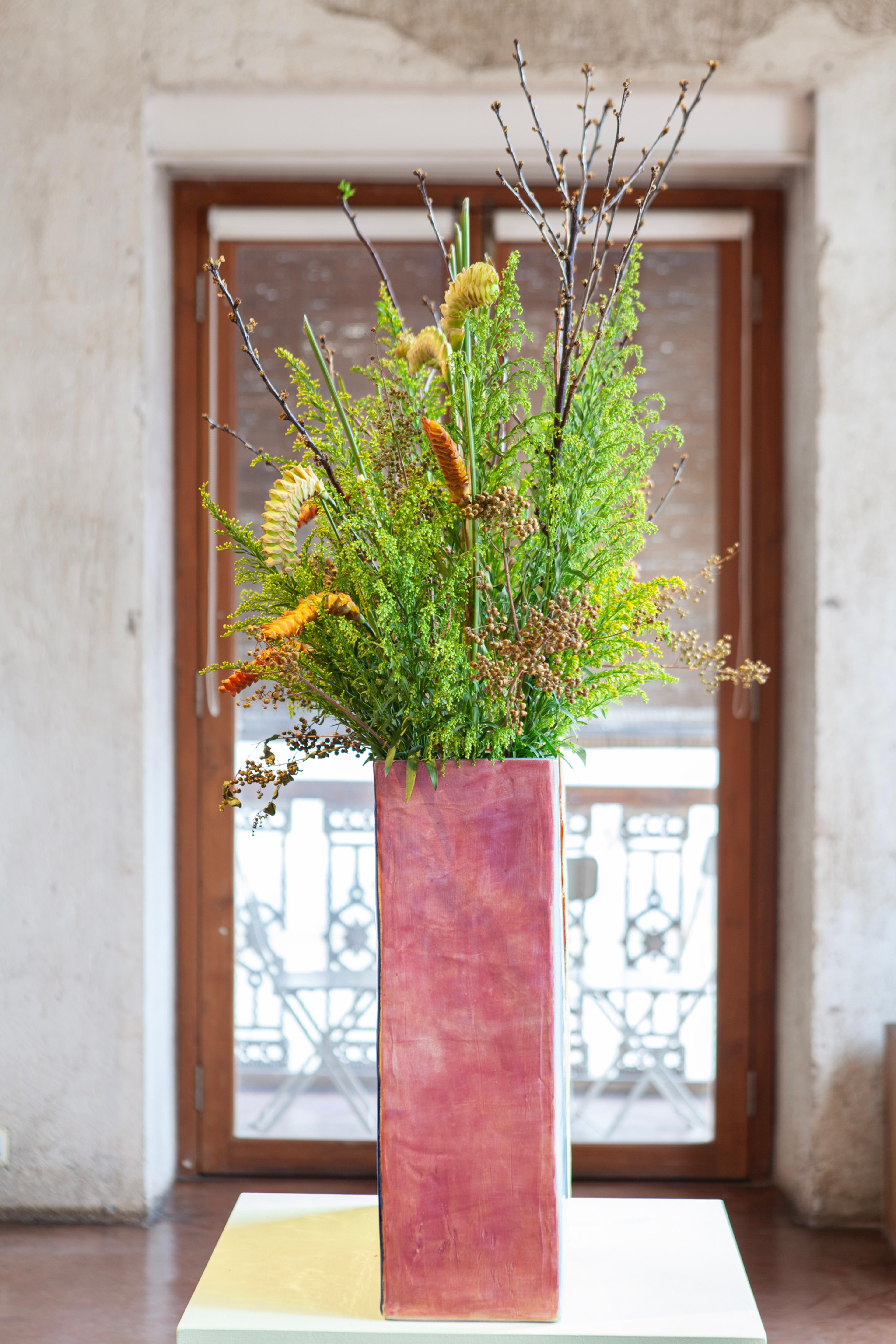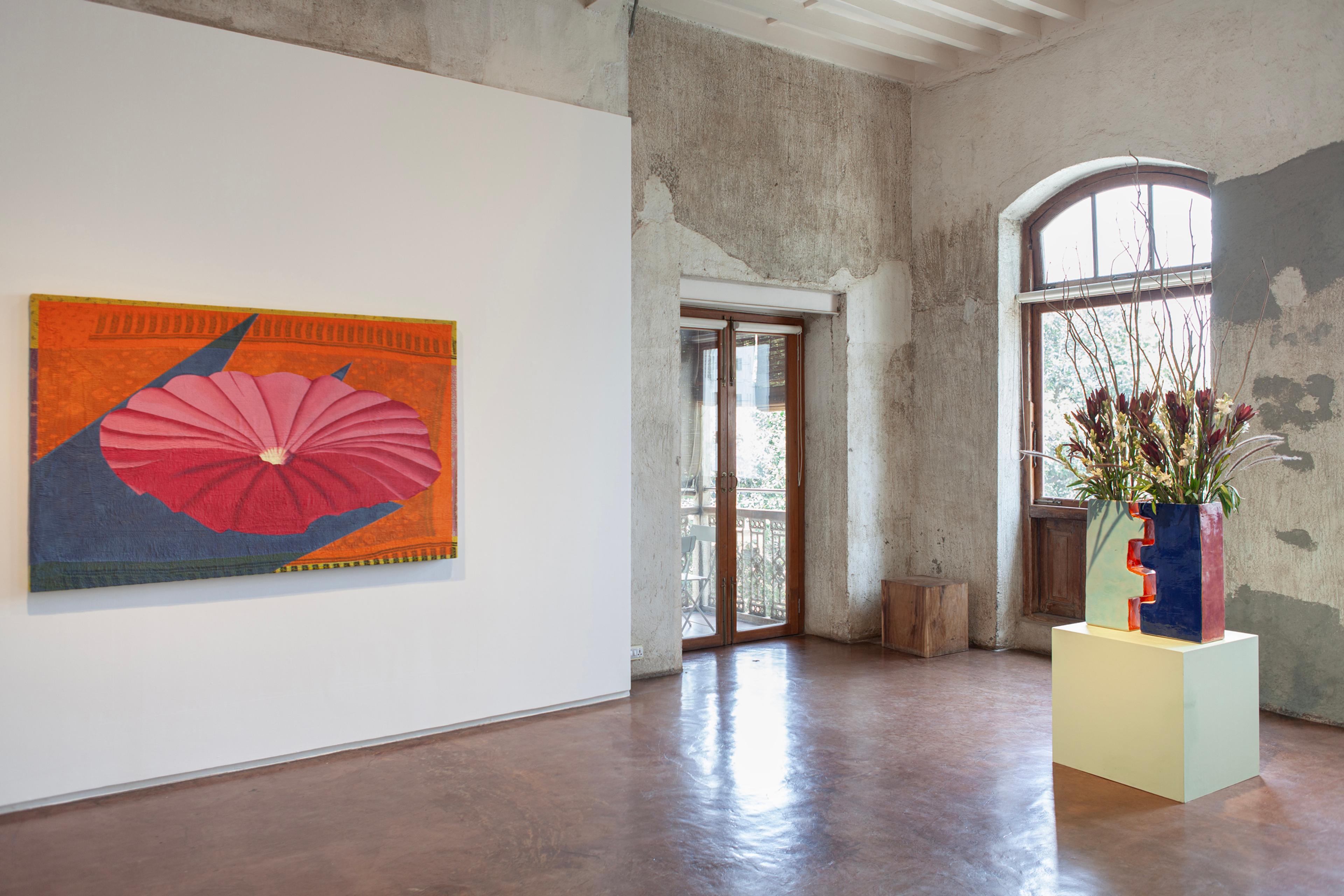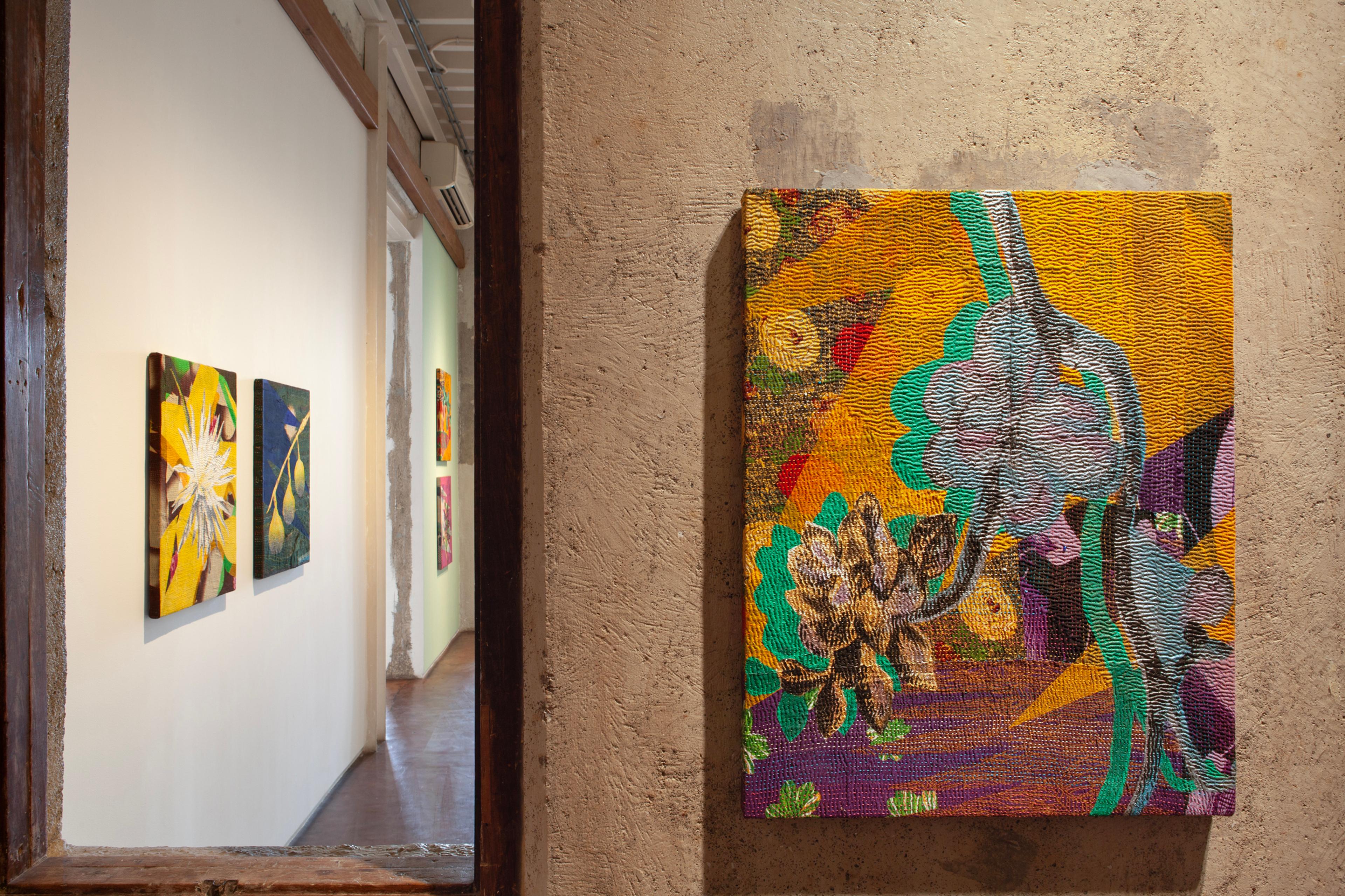 The various textile paintings, a sound score, the accompanying scent, and the ceramic work act as various ways for humans and technology (from the human hand’s connection with the paint brush and clay to AI scent generators and plant communication) to consider new ways to interface with nature and technology, and to understand the fluidity between them. The sound score is derived from field recordings of electrical frequencies generated by trees and flowers, and the scent that permeates the exhibition is an equal combination of natural and AI-generated floral notes. These have been influenced by, and in turn have influenced the choice of plants that make up the garden, exploring an idea of dispersal and species that transgress national boundaries like seeds floating in the mist.
