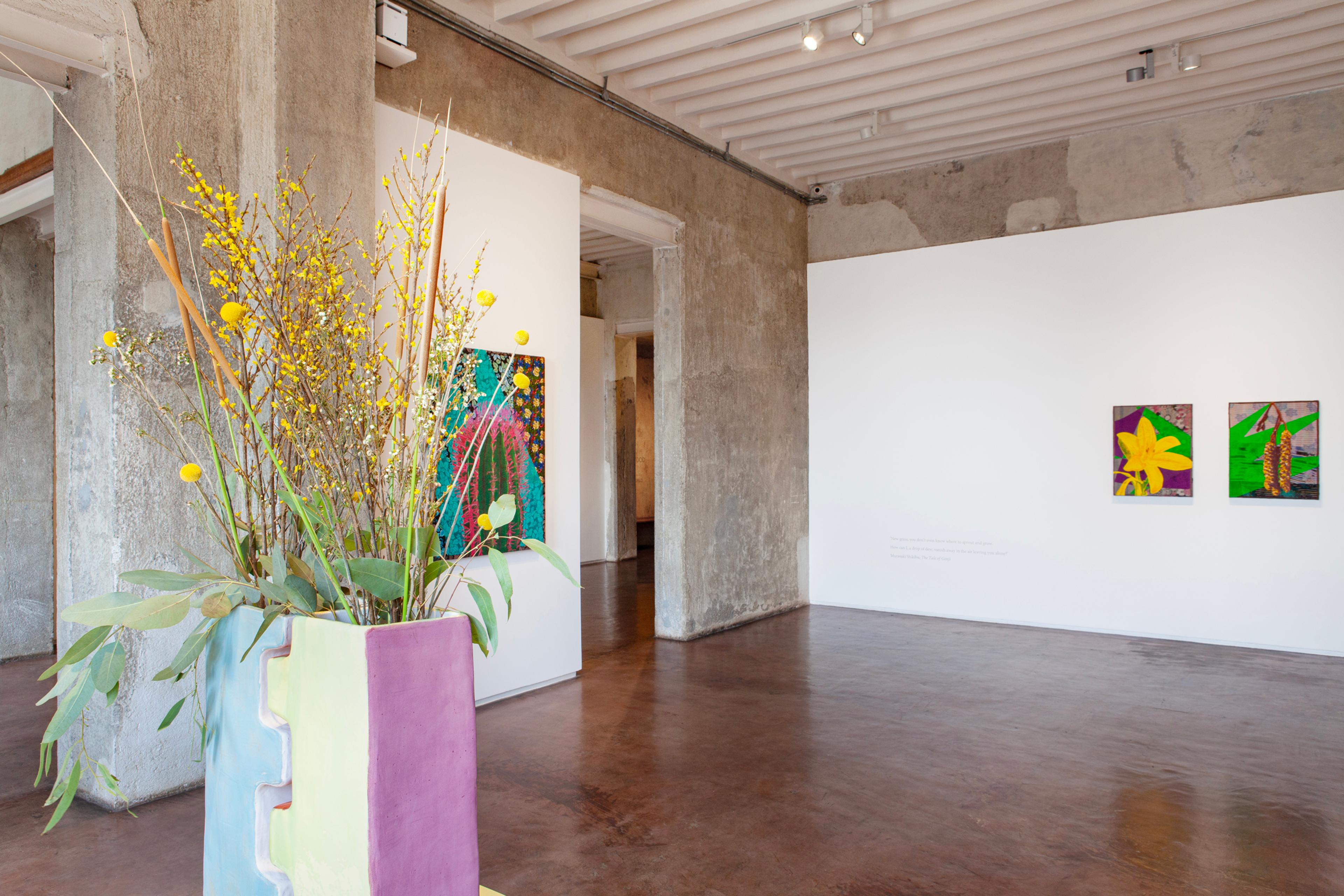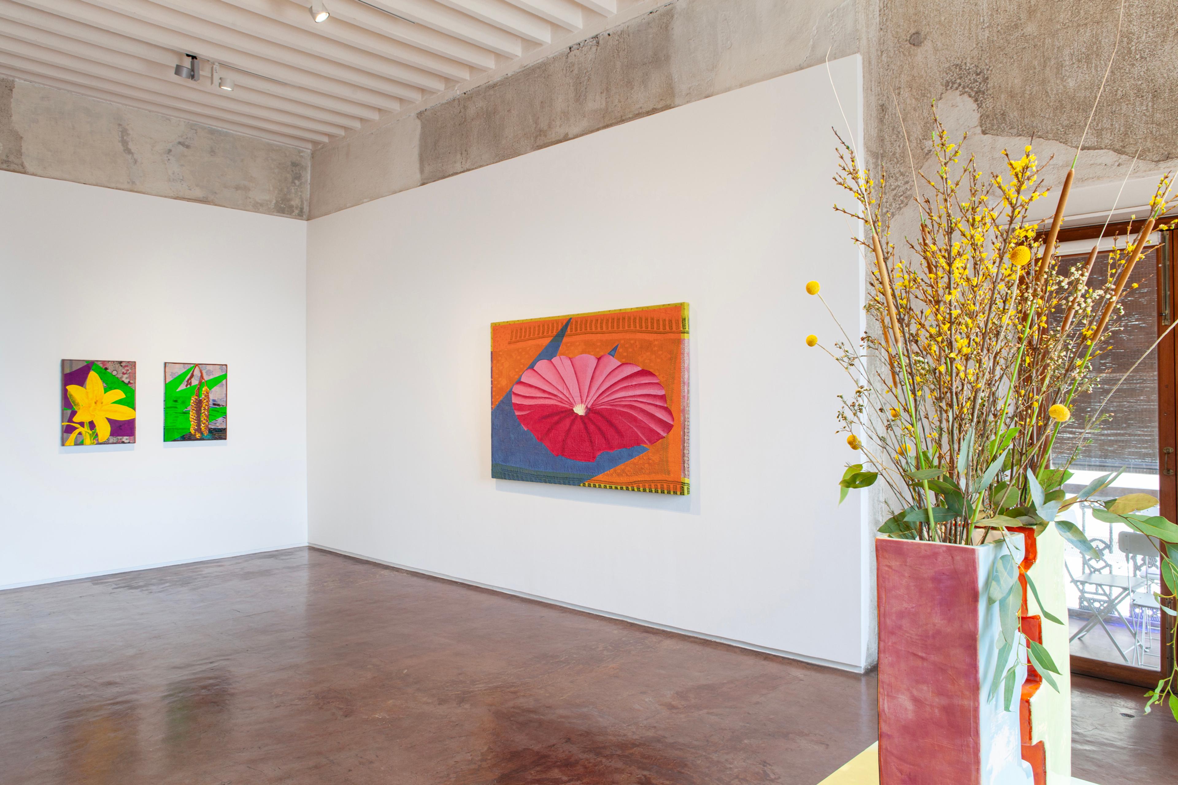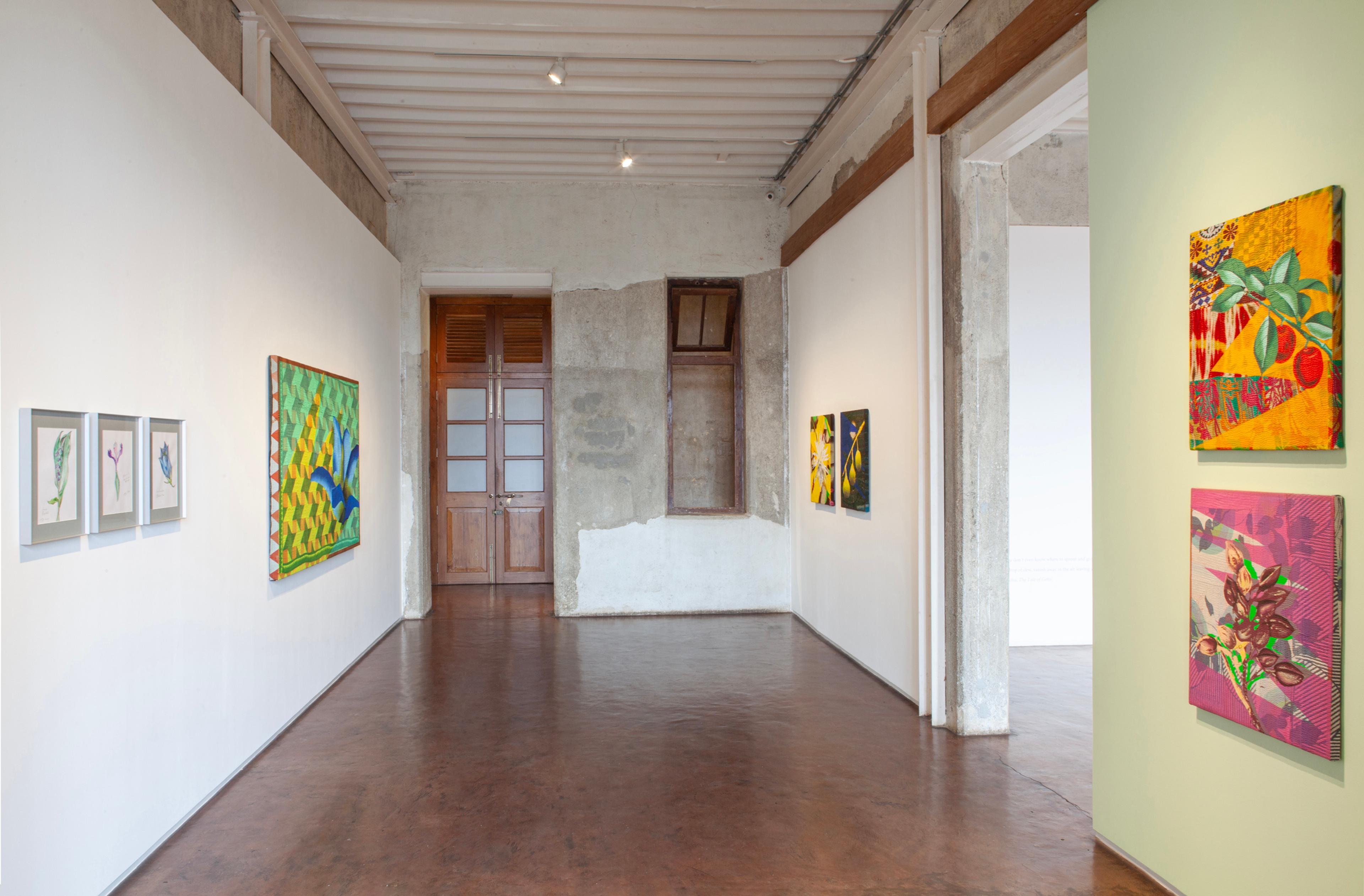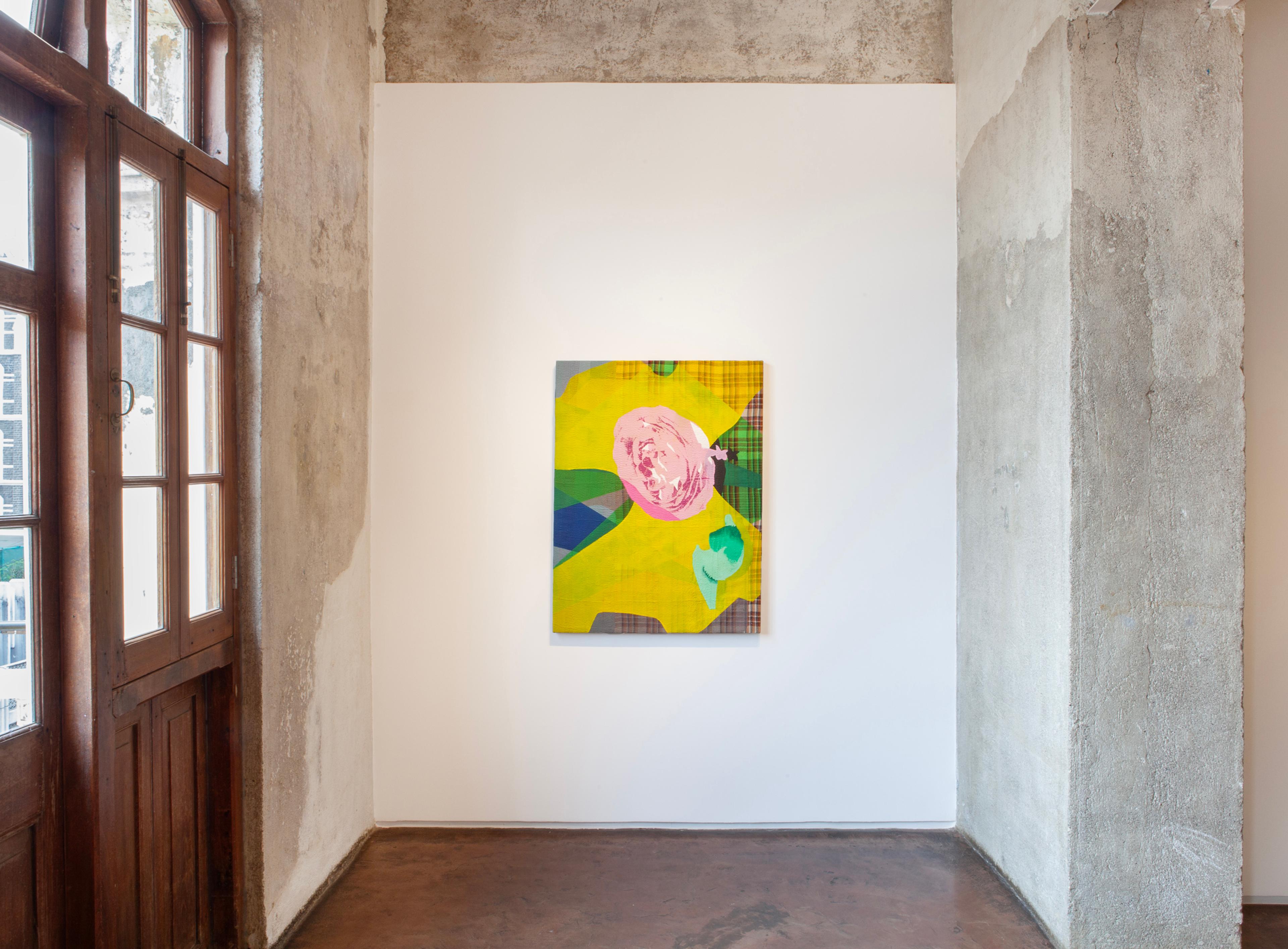 Each painting and its framing, as well as the vintage rallis on which they sit, explore a history of the representation of flowers from botanical illustration to the works of Georgia O’Keeffe, Furuya Kōrin and Benode Behari Mukherjee. The picture plane is disrupted by framing devices and geometric pattern to hint at an interior and exterior architecture, in which these individual specimens exist both within and out of time simultaneously. Delicate application of paint, artful colour shading and gradients, lovingly explore each as individual life forms, while negotiating the emergent reality principle between painting and digital modes of recreating reality.