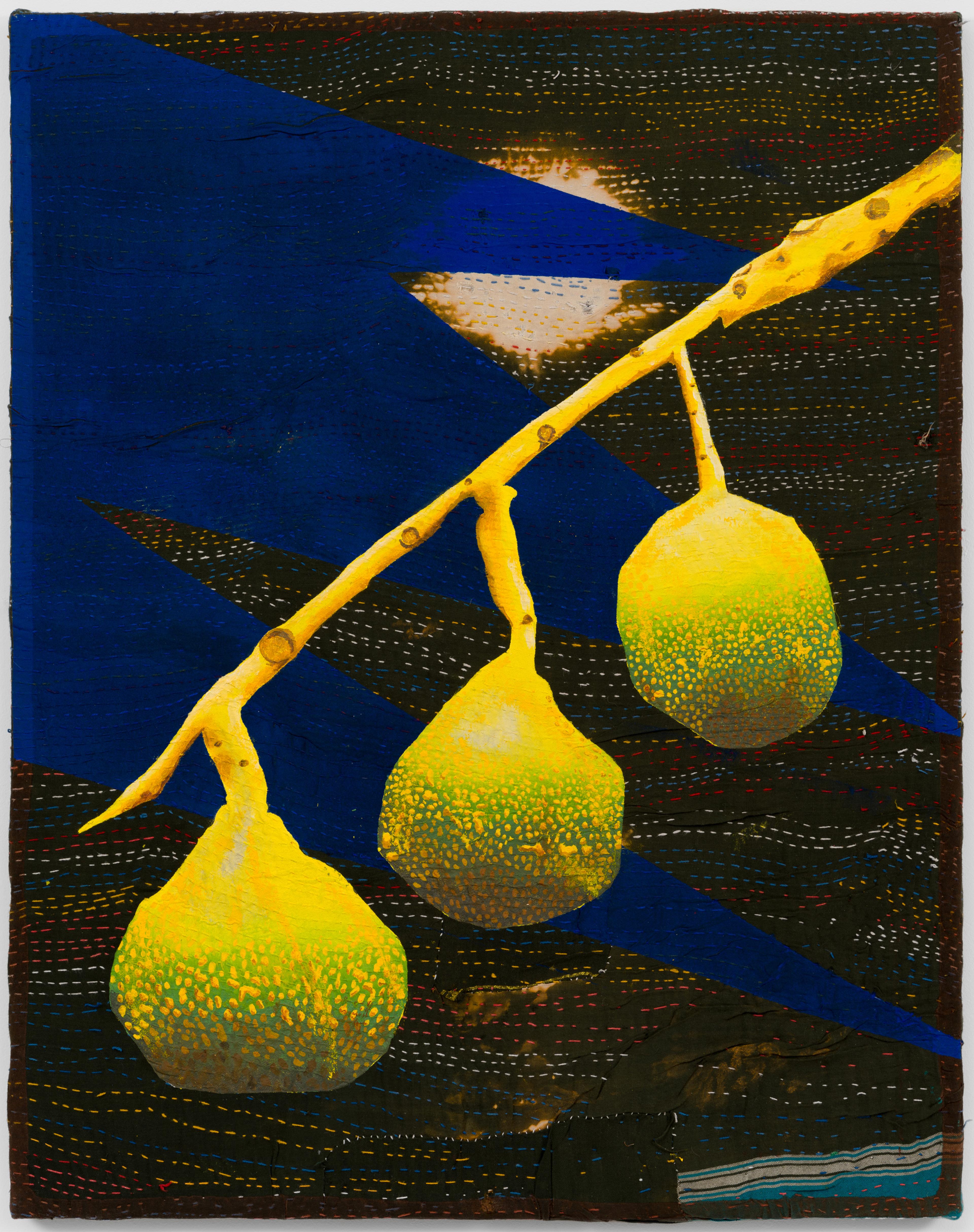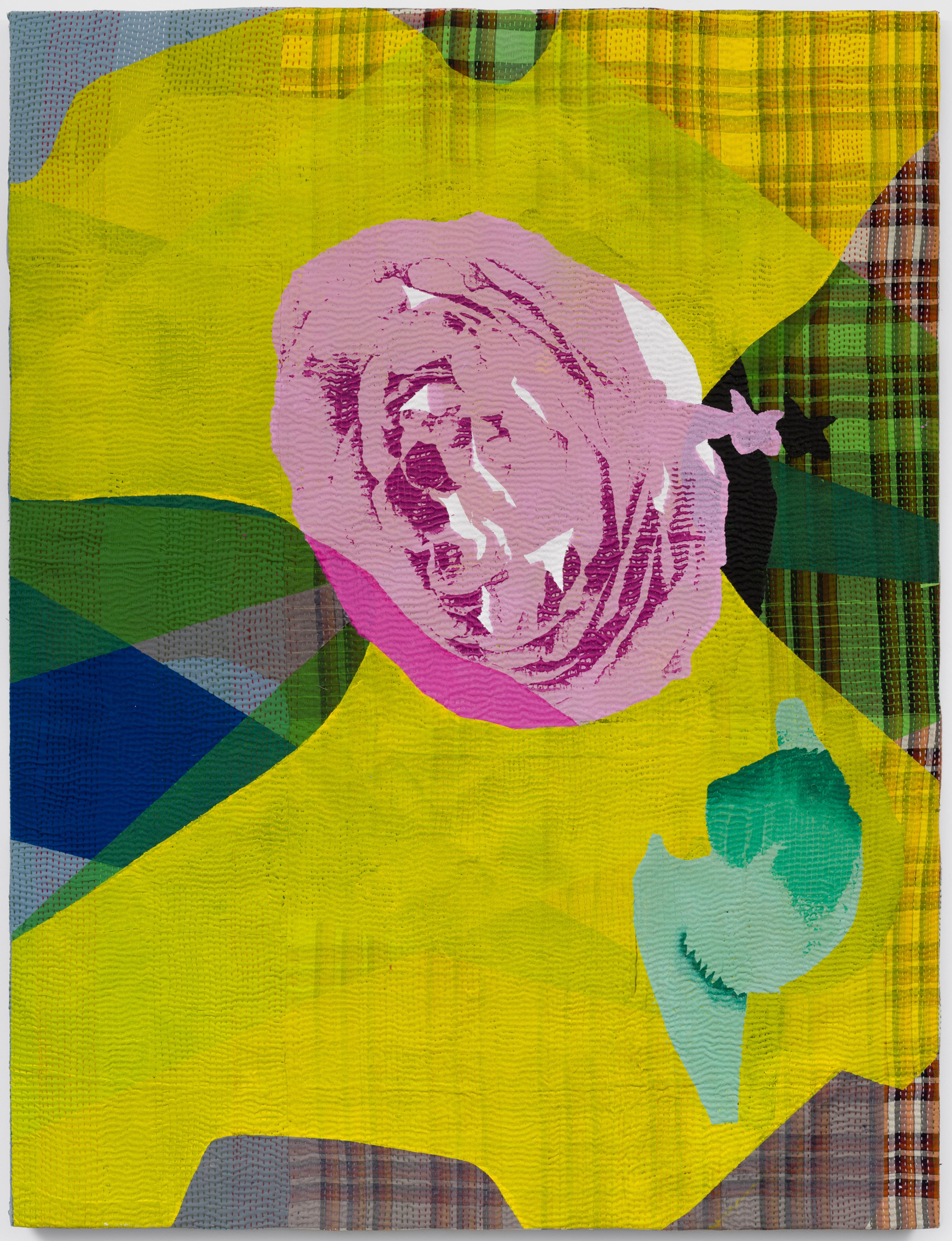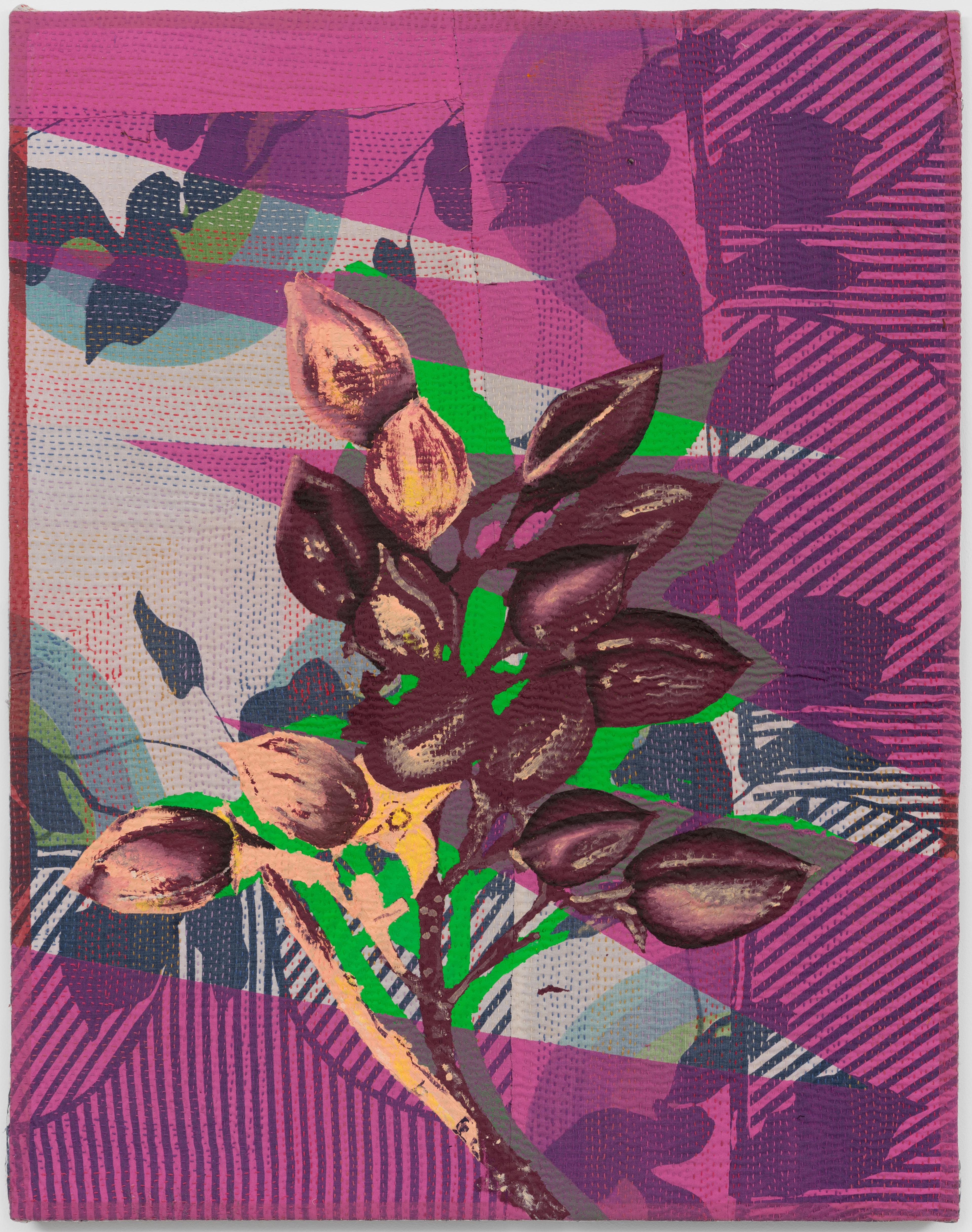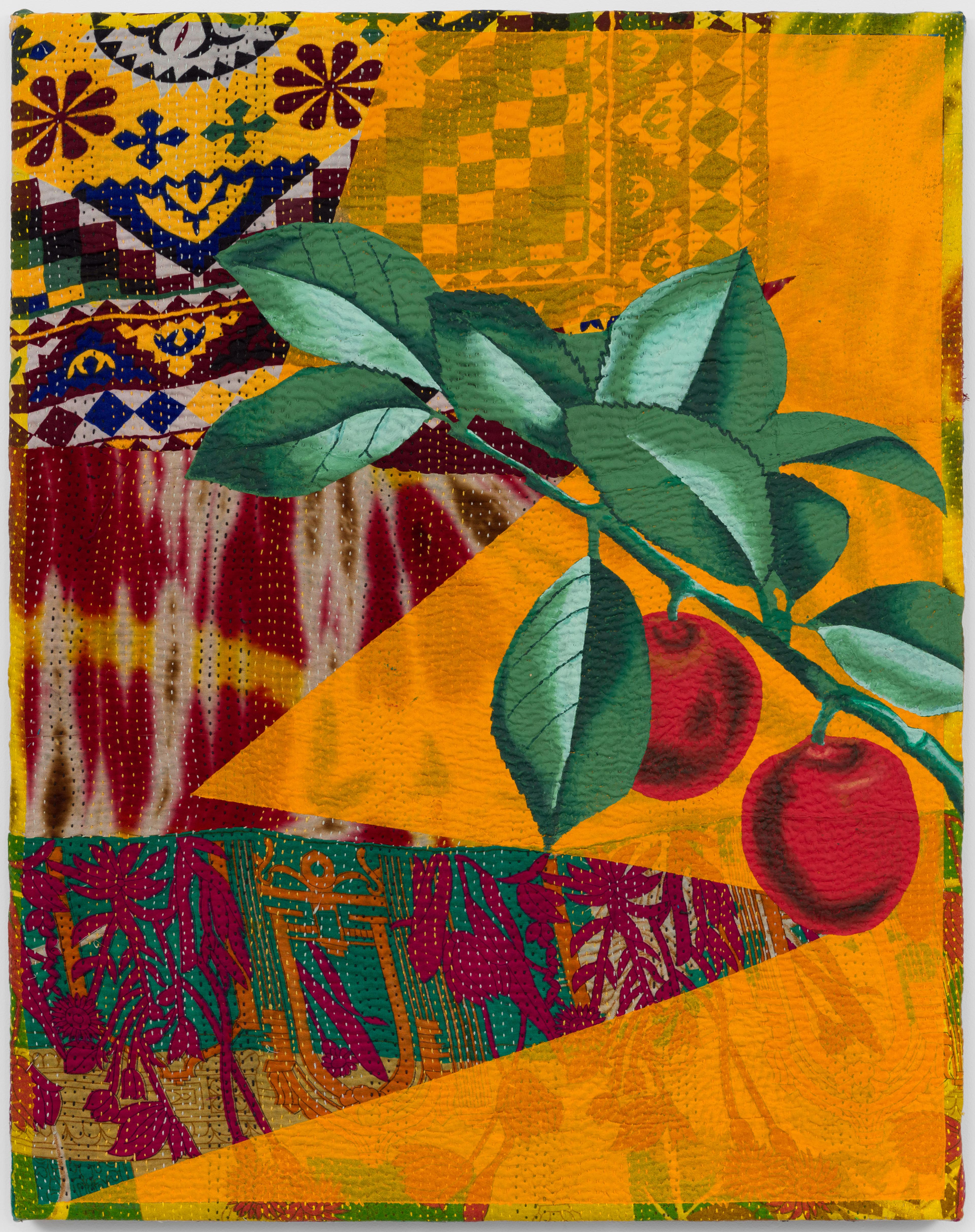 Cherry Plum, 2025. Acrylic on vintage textile, 70 x 55 cm. Courtesy of the artist and Jhaveri Contemporary. Photography © Andrew Judd.