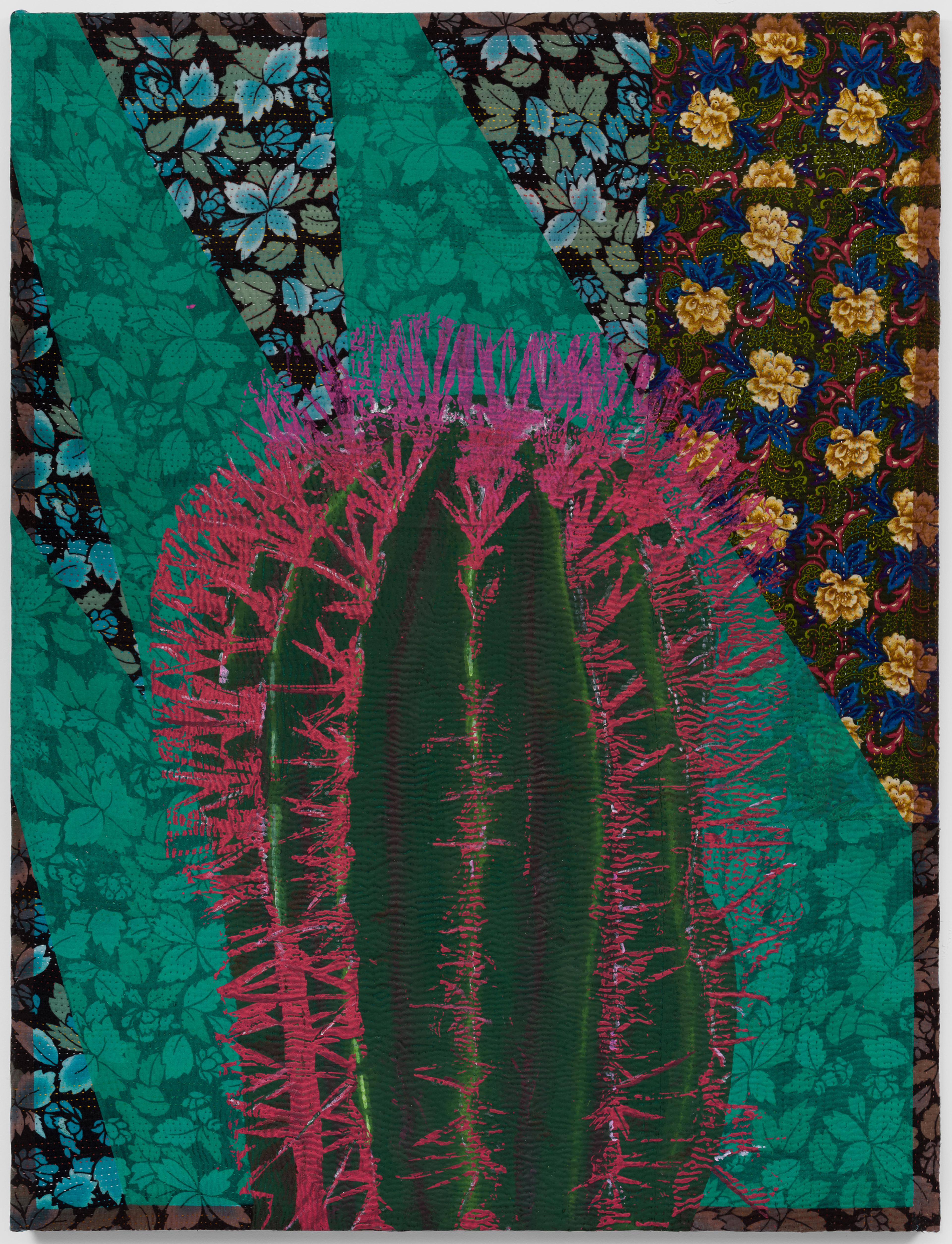 Fire Barrel Cactus, 2025. Acrylic on vintage textile, 117 x 89 cm.