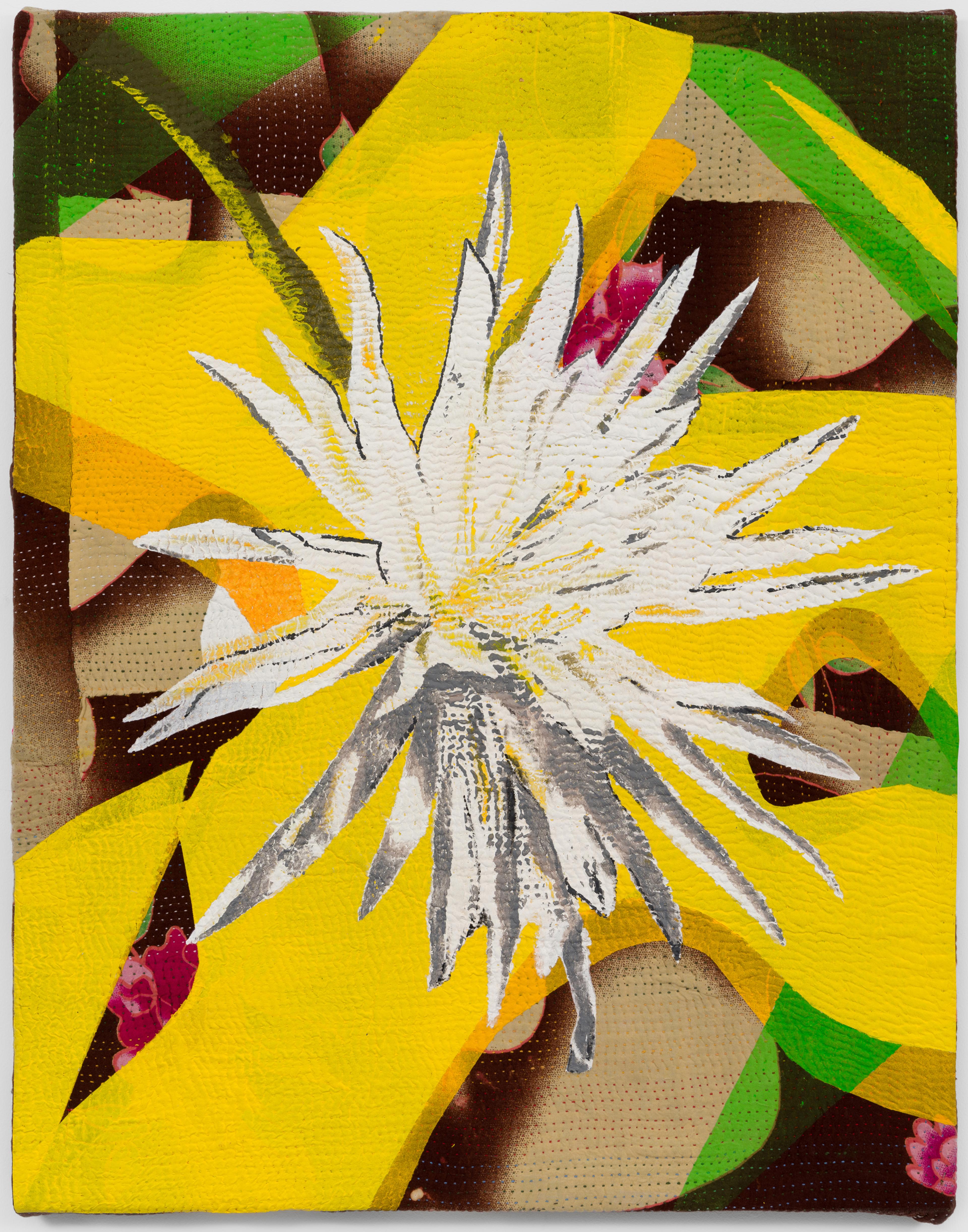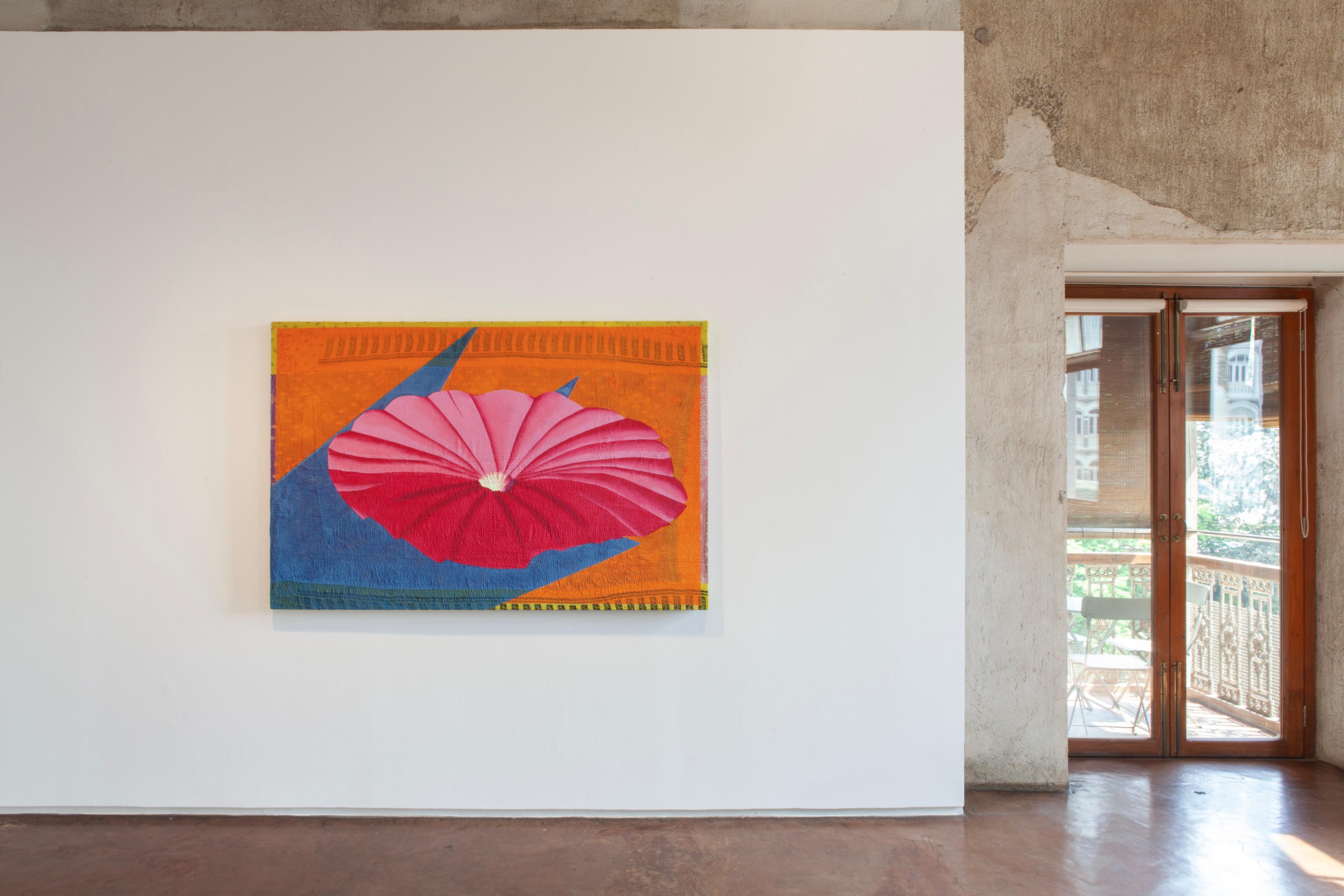 Petal Bloom 2, 2025. Acrylic on vintage textile, 117 x 178 cm.