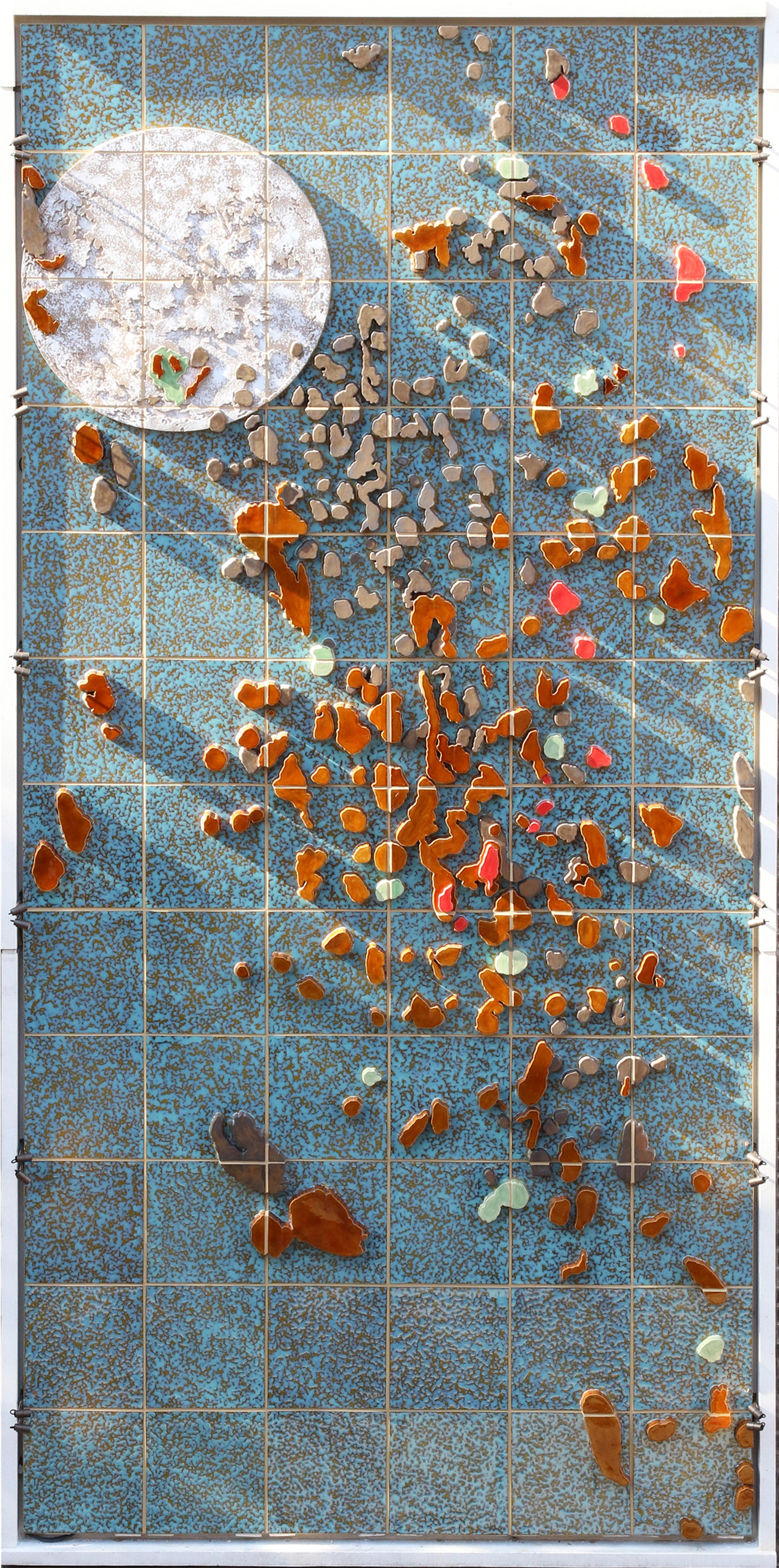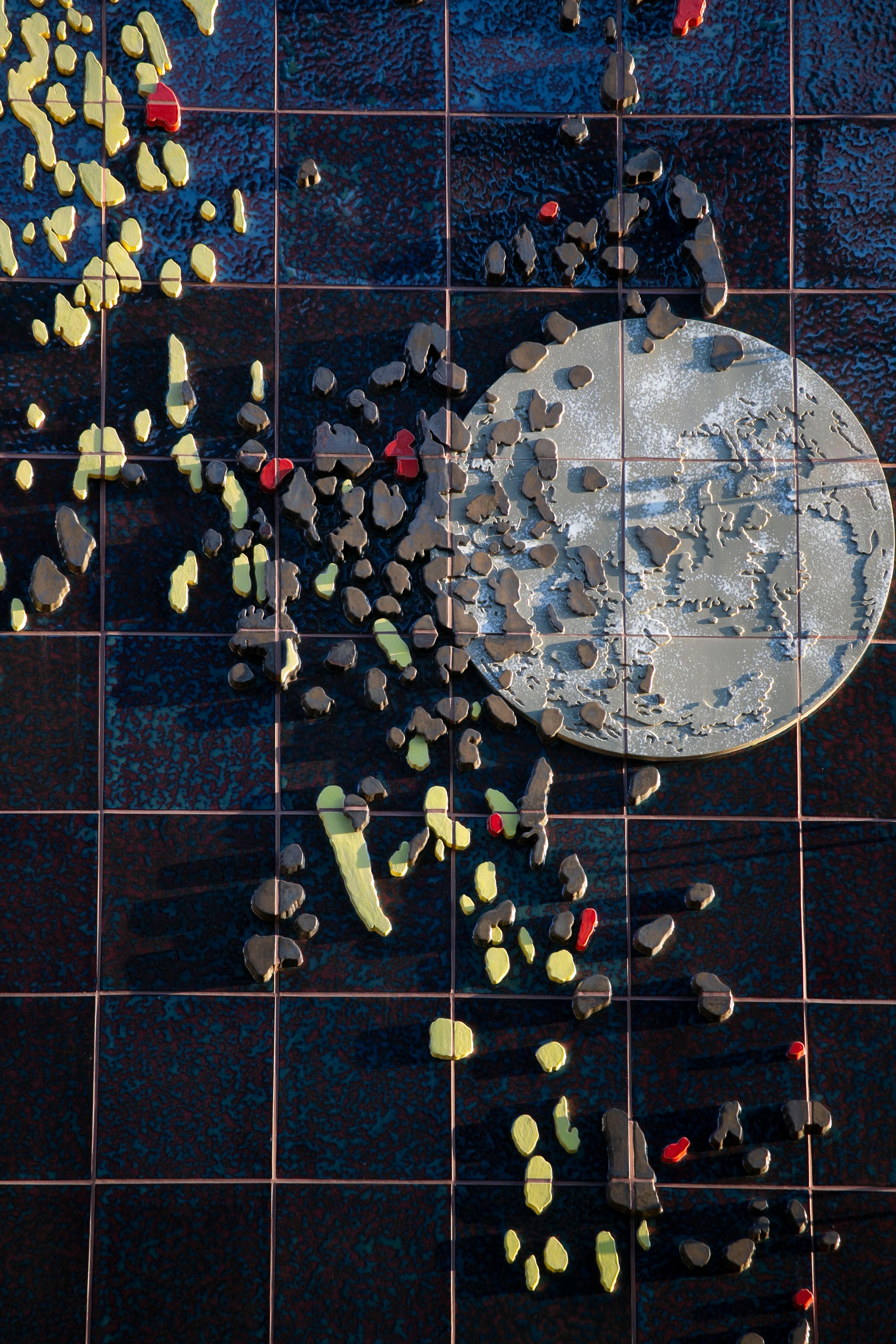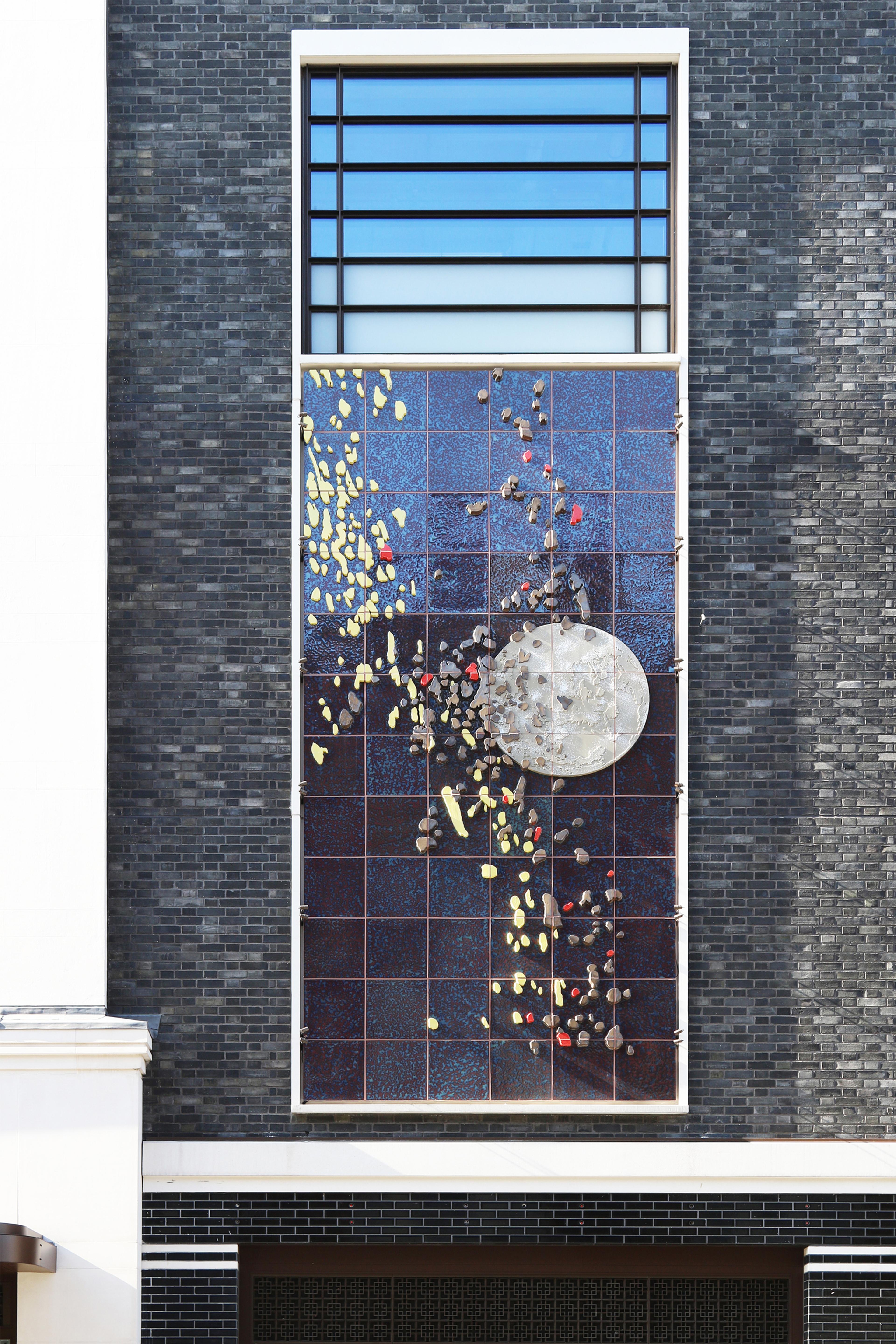 Shezad Dawood’s Cascade is a permanent public art commission for The Gaumont on the King’s Road, London. The artwork takes the form of an expansive ceramic diptych, depicting a full moon passing through the night sky, partially inspired by James Abbott McNeil Whistler’s painting Nocturne in Black and Gold, which portrays a view of fireworks falling from the sky by the Thames in Chelsea.